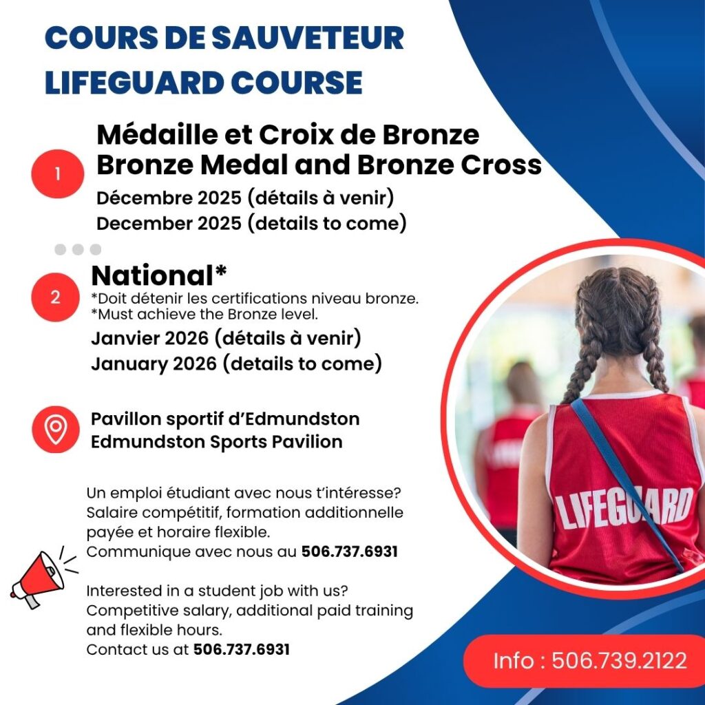 Le Pavillon sportif d’Edmundston offrira en décembre 2025 et janvier 2026, des formations de sauveteur aquatique. Ceux intéressés à s’inscrire peuvent contacter le Pavillon au 506-739-2122.