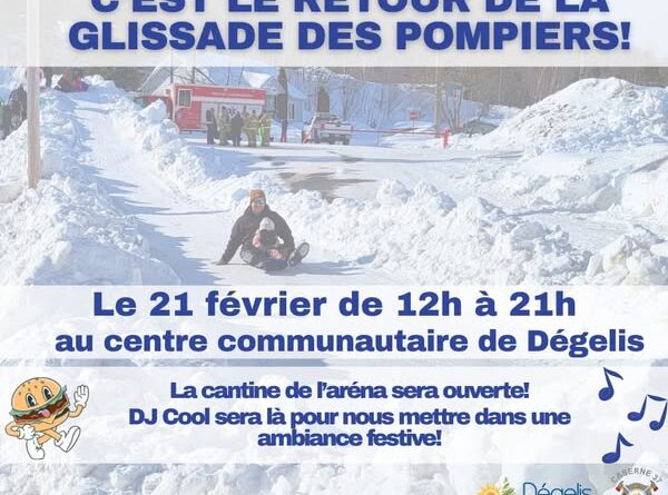 L’hiver sera animé et rassembleur le 21 février prochain à Dégelis, alors que les pompiers de la municipalité invitent petits et grands à venir profiter de la méga glissade de neige des pompiers, aménagée spécialement dans la cour du centre communautaire.