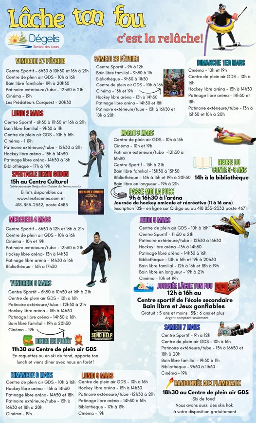 Dégelis vous attend en grand nombre pour une relâche active, rassembleuse et remplie de plaisir!