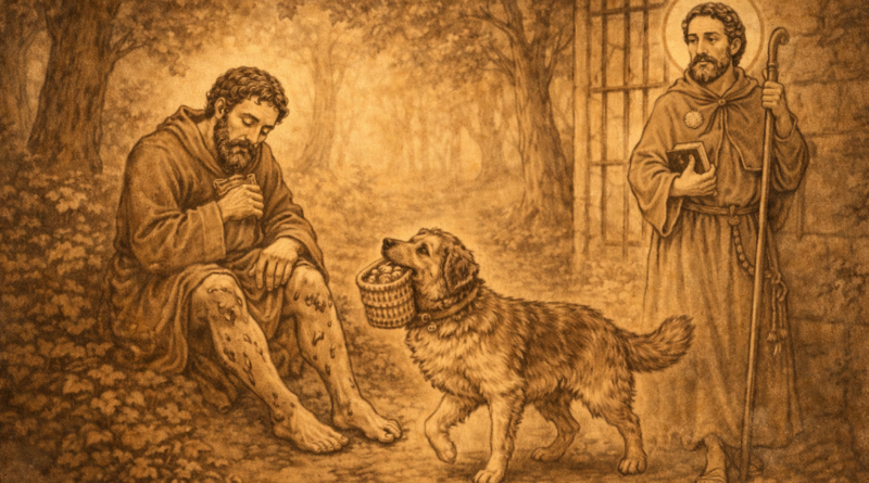 Intrigué par la disparition répétée de son pain, le maître du chien décida un jour de le suivre. Ce qu’il découvrit au cœur de la forêt le bouleversa : un homme à l’agonie, soutenu par la fidélité silencieuse d’un animal. Il le recueillit, le soigna, et peu à peu, Roch retrouva la santé.