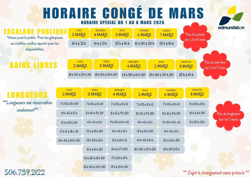 Le congé de mars approche à grands pas et du côté du Pavillon sportif d’Edmundston, tout est en place pour offrir aux citoyens une semaine active, accessible et remplie de plaisir. Afin de permettre aux familles, aux jeunes et aux amateurs d’activités physiques de profiter pleinement de cette pause bien méritée, l’équipe a préparé un horaire spécial regroupant plusieurs activités populaires.