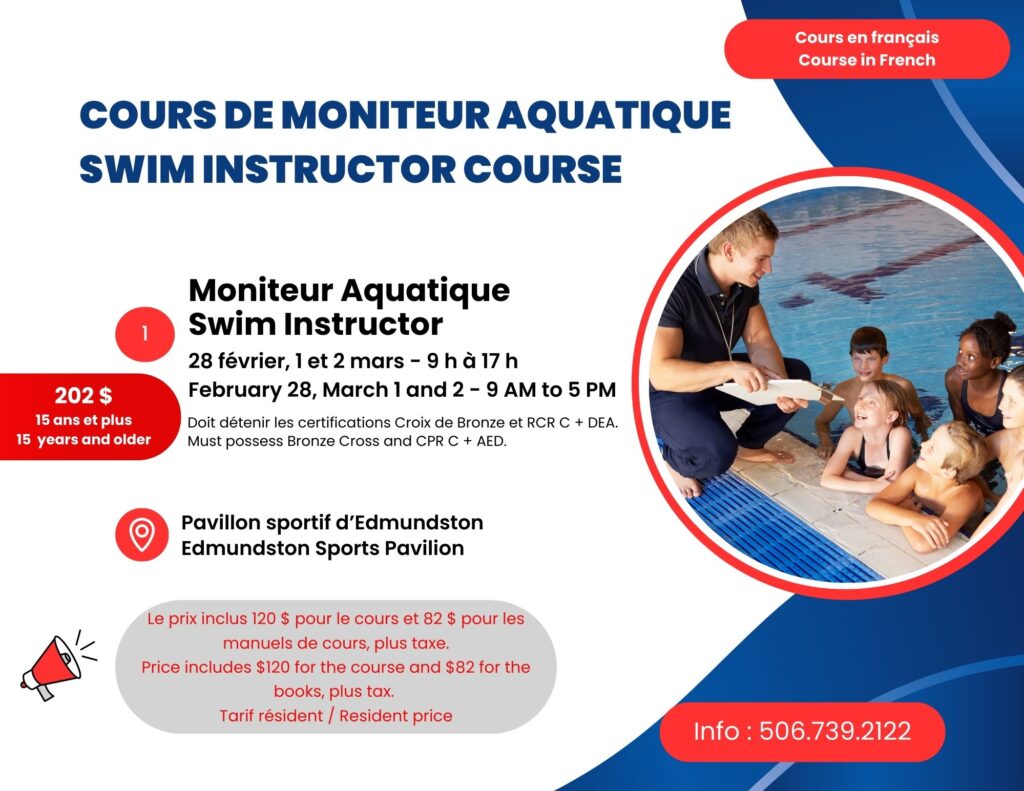 Bonne nouvelle pour les passionnés d’activités aquatiques et ceux qui souhaitent transmettre leur amour de la natation : une formation de moniteur et monitrice aquatique sera offerte prochainement à la piscine du Pavillon sportif d’Edmundston.